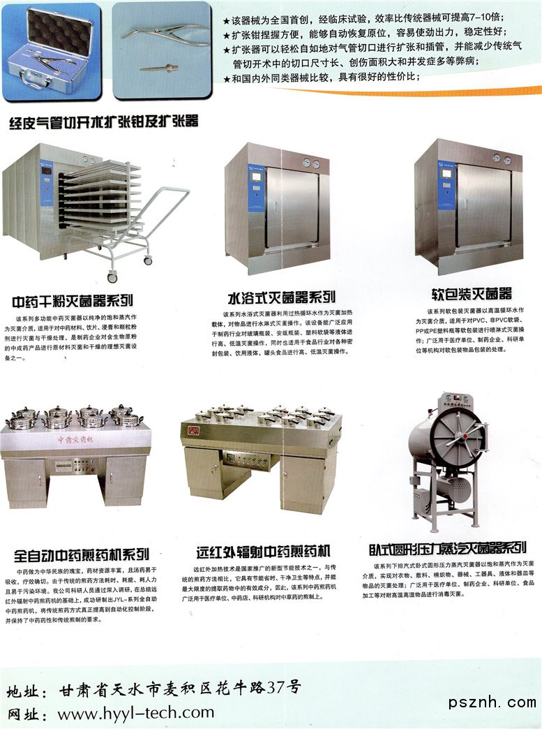 "劍齒象"牌系列消毒滅菌設(shè)備連續(xù)多年榮獲國家《中國知名滅菌器十佳品牌》,2009年"劍齒象",被甘肅省評為著名商標(biāo)。"金銀花"牌遠(yuǎn)紅外輻射中藥煎藥機(jī)獲國家科技進(jìn)步二等獎并遠(yuǎn)銷東南亞地區(qū),深受用戶青睞。