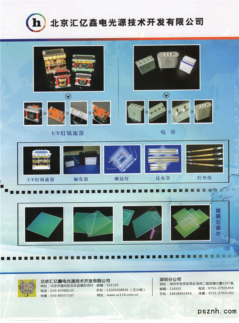 本公司成立于97年,一直致力于UV光源及配套設(shè)備的開發(fā)和研究,并先后在深圳、蘇州設(shè)立分公司。 我公司產(chǎn)品銷往全國各地并遠(yuǎn)銷中南亞及歐洲等地,受到各企業(yè)的好評及認(rèn)可,我公司現(xiàn)有客戶例舉如下: 木 業(yè):宜華木業(yè)、上海匯隆木業(yè)、森林王木業(yè)、云南嶺東木業(yè)等; 光盤業(yè):香港華揚(yáng)、中新聯(lián)、旭日光盤; 光纖光纜業(yè):江蘇恒通、沈陽亨通、成都亨通、武漢長飛; 印刷業(yè):上海煙草、上海中華、江蘇太平洋、江陰聯(lián)通、浙江偉博、浙江天外、云南玉溪彩印、云南僑通包裝、云南萬鴻集團(tuán)、臺灣財(cái)益等幾十家煙標(biāo)包裝印刷及設(shè)備廠。 設(shè)備廠:華南機(jī)械、光明、金芒果、特林機(jī)械、富林等。 幾年來我司一直給北京貞亨利配套UV系統(tǒng)。 目前正與北人印刷機(jī)械股份有限公司合作,聯(lián)手開發(fā)和研制印刷機(jī)配套UV及IR系統(tǒng)。 主要產(chǎn)品: 1.紫外線高壓汞燈 2.碘鎵燈 3.紅外線燈 4.與上述產(chǎn)品相配套的變壓器、電容、鎮(zhèn)流器、觸發(fā)器、反光罩、石英片、 5.德國產(chǎn)UV能量計(jì) 6. 進(jìn)口石英管材和反光鋁。 7.另配海德堡、羅蘭、小森設(shè)備的紫外線UV和紅外線IR光源。 8.代理各種型號進(jìn)口UV燈。 注:以上產(chǎn)品的規(guī)格可根據(jù)您的具體要求訂做。