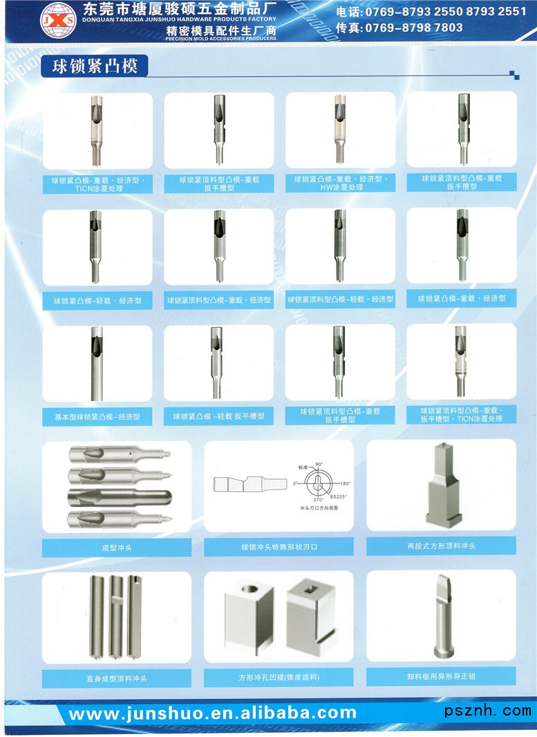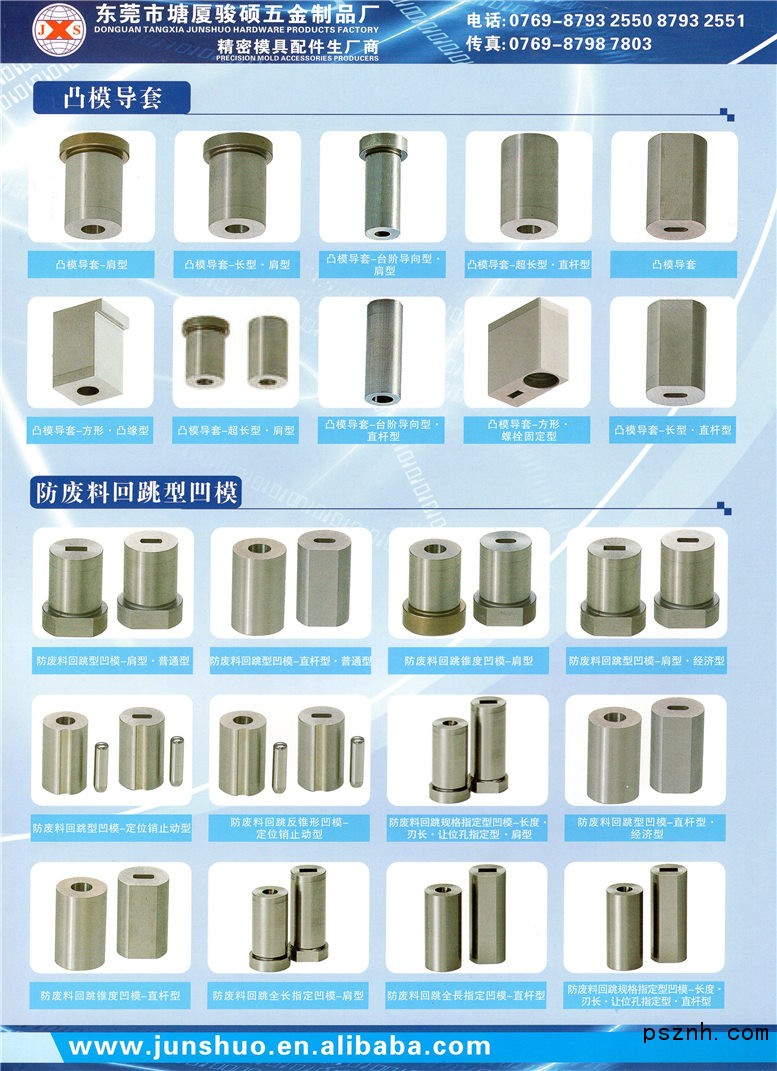 東莞市塘廈駿碩五金制品廠 本公司成立于2005年,位于東莞市塘廈鎮(zhèn)林村占地為200000平方米的鯉牙塘工業(yè)園內(nèi)。現(xiàn)有100多人,是一家集生產(chǎn)和銷售于一體為模具生產(chǎn)供應(yīng)系列產(chǎn)品與配套的專業(yè)公司。主要產(chǎn)品有:五金模、沖壓模、汽車模、端子模等模具標(biāo)準(zhǔn)及非標(biāo)準(zhǔn)精密配件( 導(dǎo)柱導(dǎo)套、 耐磨板 ) 、精密級(jí) HASCO、 D-M-E 、DANLY、伍全、盤起、MISUMI、FIBRO、Lamina、Lempco、三楔、日本大同等各國(guó)標(biāo)準(zhǔn)精密模具配件。接受客戶指定材料附圖加工,公司同時(shí)致力發(fā)展汽車、機(jī)械、電子等領(lǐng)域的標(biāo)準(zhǔn)非標(biāo)準(zhǔn)高精軸套類產(chǎn)品的生產(chǎn)與配套。