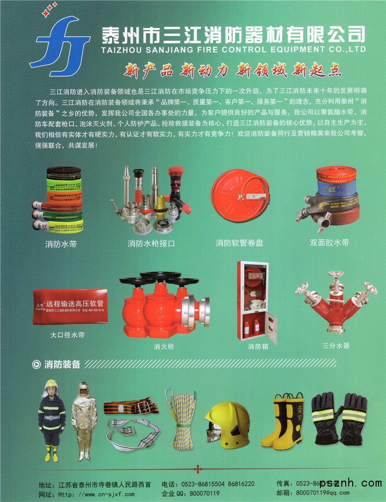 我公司成立于2003年,現(xiàn)擁有四個(gè)現(xiàn)代化的生產(chǎn)廠區(qū),占地面積達(dá)二百余畝,擁有海星分公司、三江五湖貿(mào)易有限公司、江蘇三江消防工程公司、揚(yáng)州江雨消防等多個(gè)子公司,累計(jì)注冊(cè)資本達(dá)叁仟萬(wàn)元,專(zhuān)業(yè)生產(chǎn)消防水帶、水槍接扣、泡沫藥劑、滅火器、消防栓箱,提供消防工程的設(shè)計(jì)和施工服務(wù),年產(chǎn)值過(guò)億元,是一家專(zhuān)業(yè)生產(chǎn)消防器材超大型企業(yè)。