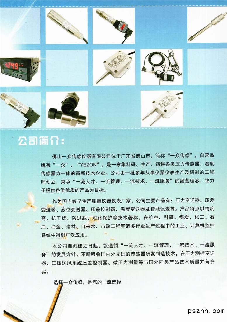 佛山一眾傳感儀器有限公司 簡(jiǎn)稱“一眾傳感” ,位于全國經(jīng)濟(jì)技術(shù)發(fā)展最迅速最成熟的地區(qū)之一——佛山,是一家專業(yè)研發(fā)、生產(chǎn)、銷售、服務(wù)各類壓力傳感器、智能控制系統(tǒng)一體化的優(yōu)質(zhì)廠家。自營品牌有“一眾”,“YEZON”,我公司集國內(nèi)外同類產(chǎn)品的優(yōu)點(diǎn),以抗干擾,防水,防過載,短路保護(hù)等技術(shù)著稱,具有先進(jìn)的工藝設(shè)備及完善的測(cè)試手段,嚴(yán)格保證產(chǎn)品制造質(zhì)量。