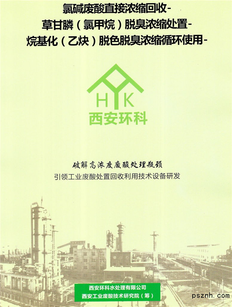 西安環(huán)科水處理有限公司經(jīng)過多年研究,成功研發(fā)出應(yīng)用于鋼鐵、鉛鋅冶煉、印刷電路板、制藥、冶金礦山、五氧化二釩等行業(yè)生產(chǎn)過程中產(chǎn)生的廢酸處理設(shè)備,研發(fā)了低濃度廢酸處理設(shè)備、高濃度有機廢酸處理設(shè)備(PVC、乙炔、烷基廢酸等)以及特種酸處理設(shè)備。為我國廢酸處理專業(yè)設(shè)備填補了空白,為節(jié)能減排做出非常大的貢獻。