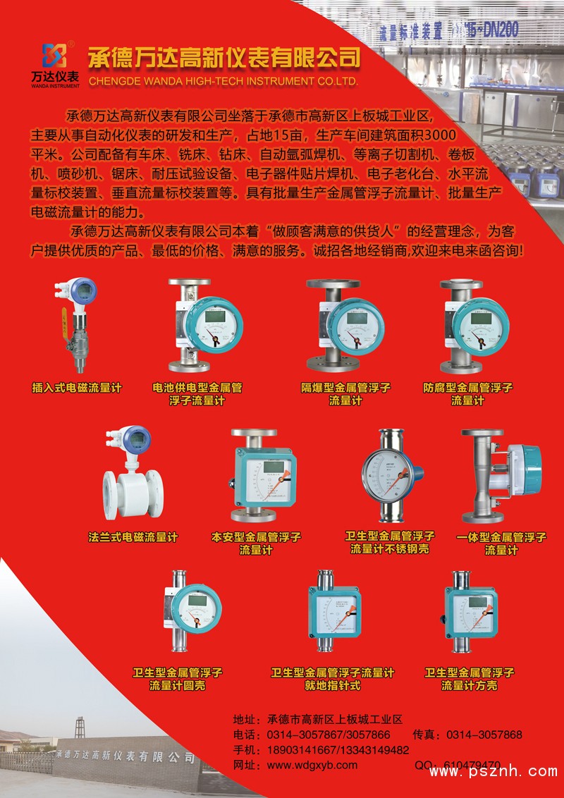 承德萬達高新儀表有限公司承德萬達高新儀表有限公司二十年專注于金屬管轉(zhuǎn)子流量計和電磁流量計的研發(fā)、生產(chǎn),取得了二十多項的專利技術(shù),是國家高新技術(shù)企業(yè),河北省儀器儀表行業(yè)協(xié)會理事單位。公司建設(shè)有3000平米的車間,配備了滿足相應(yīng)要求的生產(chǎn)設(shè)備和檢測設(shè)備。公司編制了完善的生產(chǎn)工藝技術(shù)文件,培養(yǎng)鍛煉了一大批熟練的技術(shù)工人,保證了產(chǎn)品質(zhì)量穩(wěn)定可靠。公司將秉持“讓世界滿意的供貨人”理念,持續(xù)提升完善產(chǎn)品性能,滿足各個行業(yè)對產(chǎn)品的要求,最終實現(xiàn)樹立行業(yè)典范的目標。