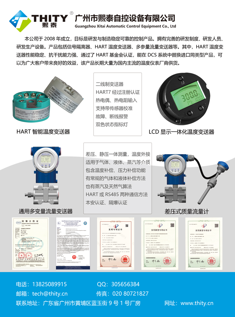 廣州市熙泰自控設(shè)備有限公司的企業(yè)使命是“研發(fā)與制造穩(wěn)定可靠的控制產(chǎn)品”,是FieldComm Group(由原來(lái)的HART基金會(huì)和FF基金會(huì)合并)正式會(huì)員、中國(guó)儀器儀表學(xué)會(huì)會(huì)員。2017年被認(rèn)定為國(guó)家高新技術(shù)企業(yè),并參與起草多項(xiàng)國(guó)家標(biāo)準(zhǔn)。主要產(chǎn)品包括智能溫度變送器、信號(hào)變換器、安全柵等產(chǎn)品。其中智能溫度變送器長(zhǎng)期為國(guó)內(nèi)主流溫度儀表廠提供OEM服務(wù),NTC溫度變送器也應(yīng)用于地鐵及高鐵項(xiàng)目中。隔離器安全柵產(chǎn)品經(jīng)過(guò)十年磨煉,技術(shù)成熟、品質(zhì)可靠,在行業(yè)內(nèi)有一定知名度。