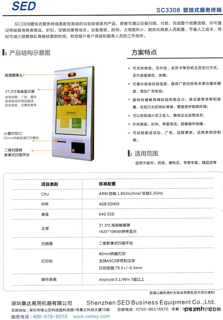 深圳桑達商用機器有限公司在桑達股份公司雄厚的技術(shù)和資金的支持下取得快速發(fā)展,現(xiàn)有員工近400人,其中40%以上是具有碩士、本科學(xué)歷或高級職稱的高素質(zhì)人才,建立起先進的管理、研發(fā)、生產(chǎn)和質(zhì)量保證體系,自主研發(fā)生產(chǎn)的POS收款機、稅控收款機、網(wǎng)絡(luò)自助終端機、移動收銀等系列產(chǎn)品,擁有強大的服務(wù)團隊,為客戶提供專業(yè)的IT運維服務(wù)。在深圳高新技術(shù)園,公司擁有近萬平方米的專業(yè)生產(chǎn)廠房,具備完善的產(chǎn)品檢測能力,所有產(chǎn)品所執(zhí)行的企業(yè)標(biāo)準(zhǔn)完全符合或超過國家標(biāo)準(zhǔn)?,F(xiàn)已形成年產(chǎn)10萬臺/套POS產(chǎn)品及100萬臺稅控產(chǎn)品的生產(chǎn)能力。特別是立足于桑達公司二十余年的收款機經(jīng)營、開發(fā)和生產(chǎn)經(jīng)驗,成為國內(nèi)收款機行業(yè)的奠基者之一。公司自一九九六年起在市場上不斷推出美觀實用、經(jīng)濟和超強穩(wěn)定的SED系列POS收款機,產(chǎn)品受到信息產(chǎn)業(yè)部、內(nèi)貿(mào)部等有關(guān)國家部委的多次肯定和廣大用戶的熱烈歡迎。公司將“真誠相伴、共創(chuàng)未來”的信念融入二十余年的POS機生產(chǎn)、銷售和服務(wù)的歷程。全體員工堅持以ISO9001質(zhì)量保證體系和ISO14001環(huán)境體系為基本要求,嚴(yán)格管理,以客戶的需求為導(dǎo)向,與客戶達成雙贏為目標(biāo),不斷為客戶提供更優(yōu)質(zhì)的產(chǎn)品和更體貼的服務(wù)。經(jīng)過二十多年的辛勤耕耘,桑達產(chǎn)品遍布全國各地,東至舟山群島、北到大慶、南及海南島、西登青藏高原、新疆石河子,所有設(shè)備歷經(jīng)各種環(huán)境考驗,盡顯卓越品質(zhì)。