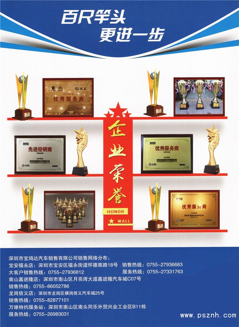深圳市寶鴻達汽車銷售有限公司是上汽集團股份有限公司旗下南京依維柯及上汽躍進品牌在深圳市正式授權(quán)的一級經(jīng)銷商,是整車銷售、配件供應、維修服務、信息反饋為一體的商用車4S運作模式。目前營業(yè)場所面積達一萬多平方,網(wǎng)絡分布于寶安區(qū)、南山區(qū)、羅湖區(qū)、龍崗區(qū)及粵東、粵西等周邊城市。主要經(jīng)營南京依維柯及上汽躍進系列車型,包括客車、卡車、廂式運輸車,以及警用車、救護車、工程車、服務車、清障車、冷藏車、檢測車、郵政車等專用汽車。公司自成立以來秉承“誠信為本”,堅持“市場是船,客戶是海,服務是帆”的服務標準,始終推行南京依維柯標準化銷售服務流程及“6S”管理工程,以“快捷、恒久、滿意”的服務理念,為個人和企事業(yè)單位提供優(yōu)質(zhì)服務,并不斷改進和完善服務品質(zhì),不斷向一流的商用車銷售服務企業(yè)邁進,打造與客戶共贏的平臺。