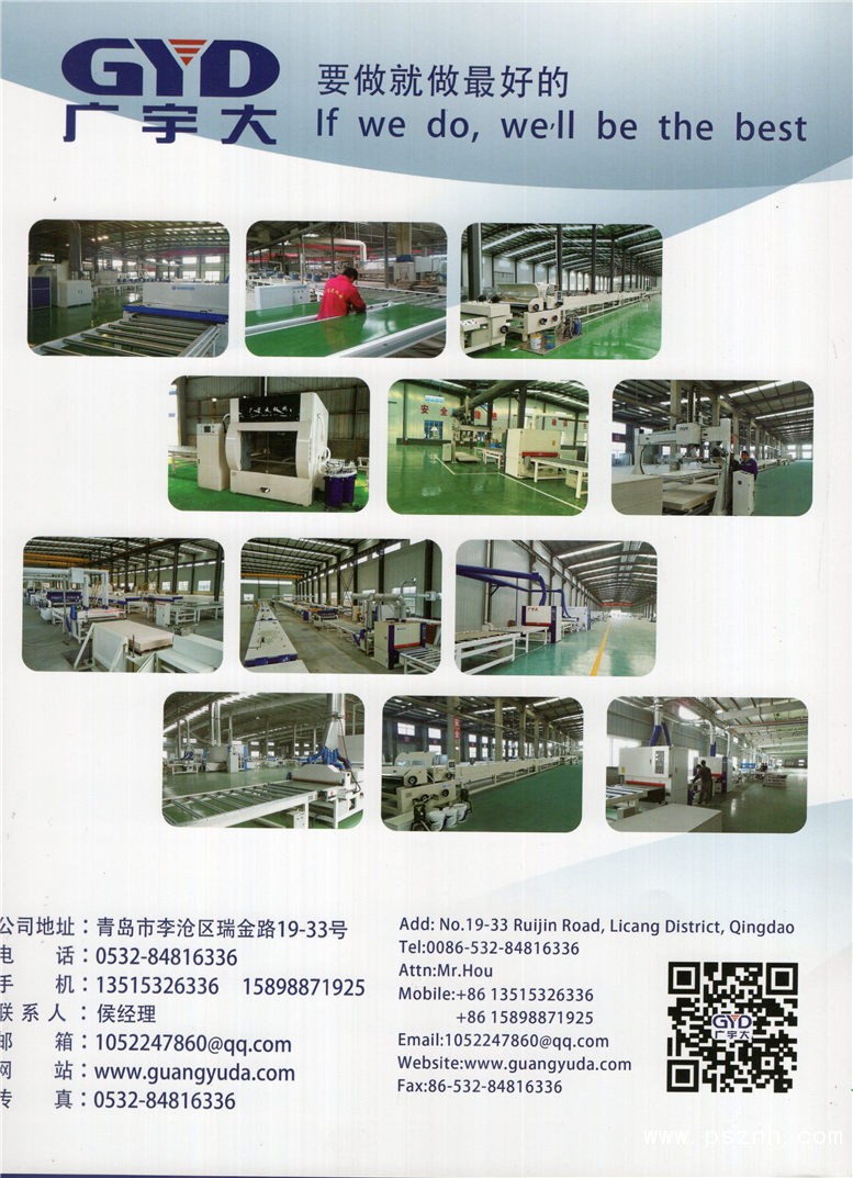青島廣宇大機械設備有限公司是專業(yè)化生產(chǎn)室內裝飾板及建筑外墻裝飾板涂裝機械設備、軟瓷設備的企業(yè)。