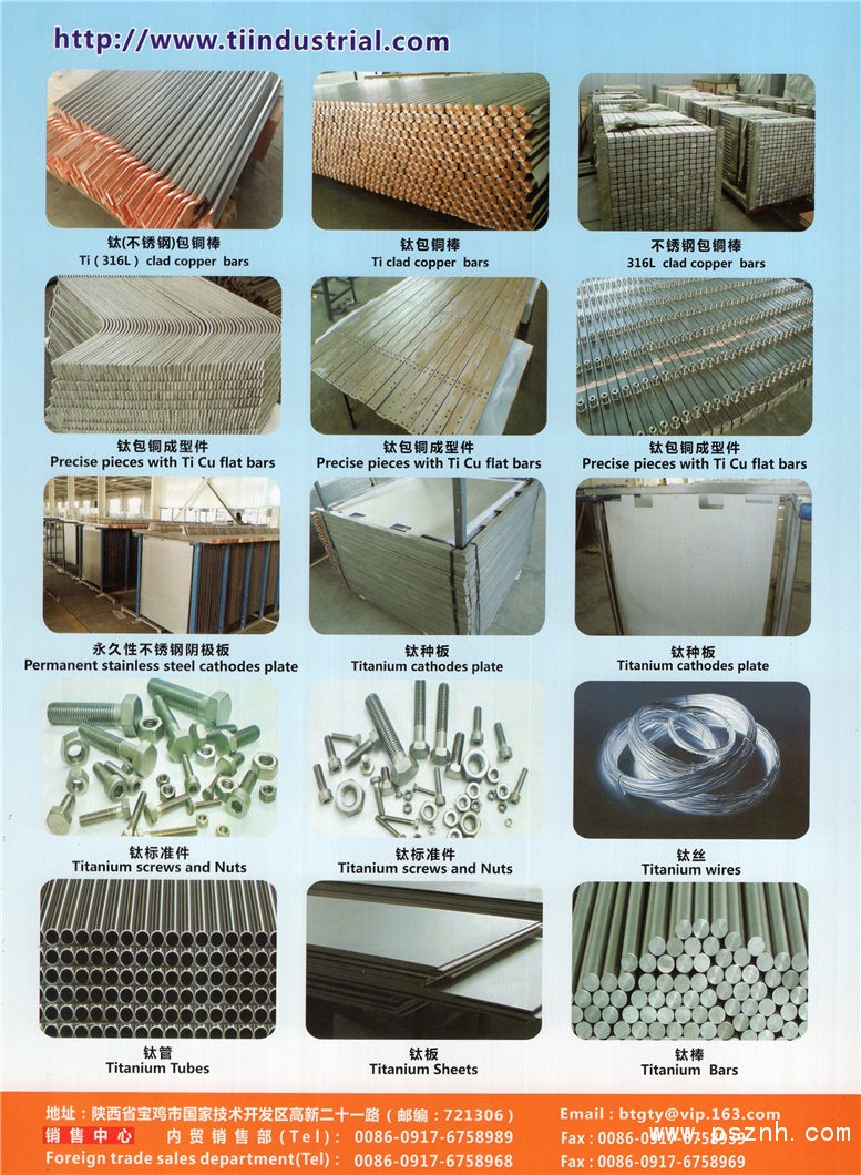 公司產(chǎn)品分為三大類:一、以鈦包銅為主的有色金屬?gòu)?fù)合材,包括:鈦包銅、鋯包銅、鋼包銅、復(fù)合絲、多層復(fù)合金屬等;二、以鈦緊固件為主的有色金屬加工制品;三、鈦材及鈦制設(shè)備。四,鈦無(wú)縫管,鈦管件,鈦管道,大口徑鈦焊管等。