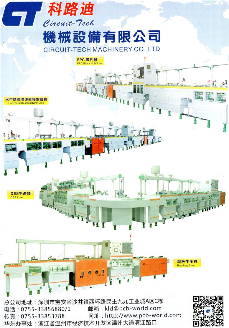 科路迪公司主要產(chǎn)品包括:各制程前/中/后處理(磨板/火山灰/噴砂機(jī)/超粗化)生產(chǎn)線;內(nèi)/外層及FPC、LCD之DES生產(chǎn)線;水平棕化線;水平除膠 渣連導(dǎo)電膠線、水平黑孔線;外層SES生產(chǎn)線。其它產(chǎn)品還包括:成品清洗生產(chǎn)線;OSP(抗氧化)生產(chǎn)線;噴錫前/后理生產(chǎn)線;LCD 及五金蝕刻等設(shè)備;自動(dòng)化周邊設(shè)備如:各式自動(dòng)上下料機(jī)、太陽式冷卻翻板機(jī)、履帶式收放板機(jī)、90度轉(zhuǎn)角轉(zhuǎn)向機(jī)、粘塵機(jī)、全自動(dòng)暫存機(jī)、銅粉過濾機(jī)等。