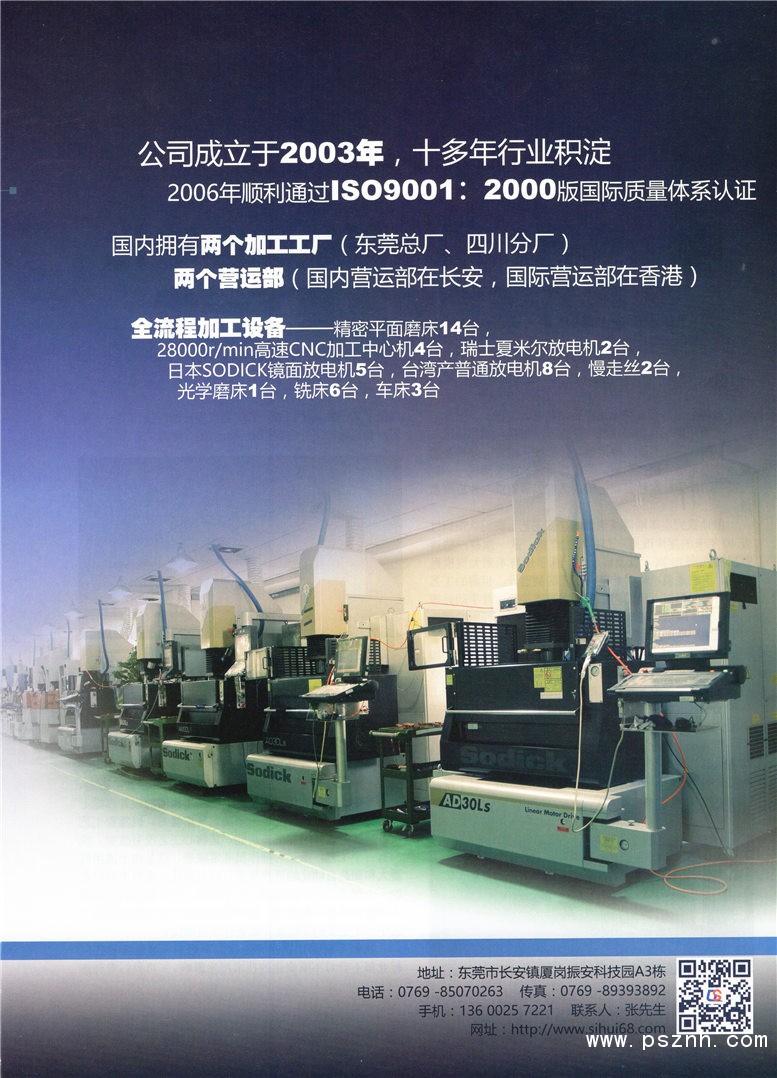 公司擁有廣大的生產(chǎn)制造能力。在國內(nèi)擁有三個(gè)加工工廠(東莞總廠、上海分廠四川分廠),兩個(gè)營運(yùn)部(國內(nèi)營運(yùn)部在長安,國際營運(yùn)部在香港),擁有世界一流的加工設(shè)備,日本精密平面磨床14臺,28000r/min高速CNC加工中心機(jī)4臺,瑞士夏米爾放電機(jī)4臺,日本SODICK鏡面放電機(jī)5臺,臺灣產(chǎn)普通放電機(jī)12臺,CNSC加工中心6臺,慢走絲4臺,光學(xué)磨床2臺,銑床6臺,車床3臺,各加工工廠和各部門通過優(yōu)化組合,模具設(shè)計(jì)與制造和精密模具零件加工三大生產(chǎn)體系,以產(chǎn)品為龍頭帶動(dòng)塑膠模具的開發(fā)設(shè)計(jì),制造以及售后維護(hù)等。產(chǎn)品主要銷往日本、歐美和中國大陸等地,因精度高、質(zhì)量好、納期短等特點(diǎn)、已贏得了國內(nèi)外廣大客戶的贊譽(yù)和信任。