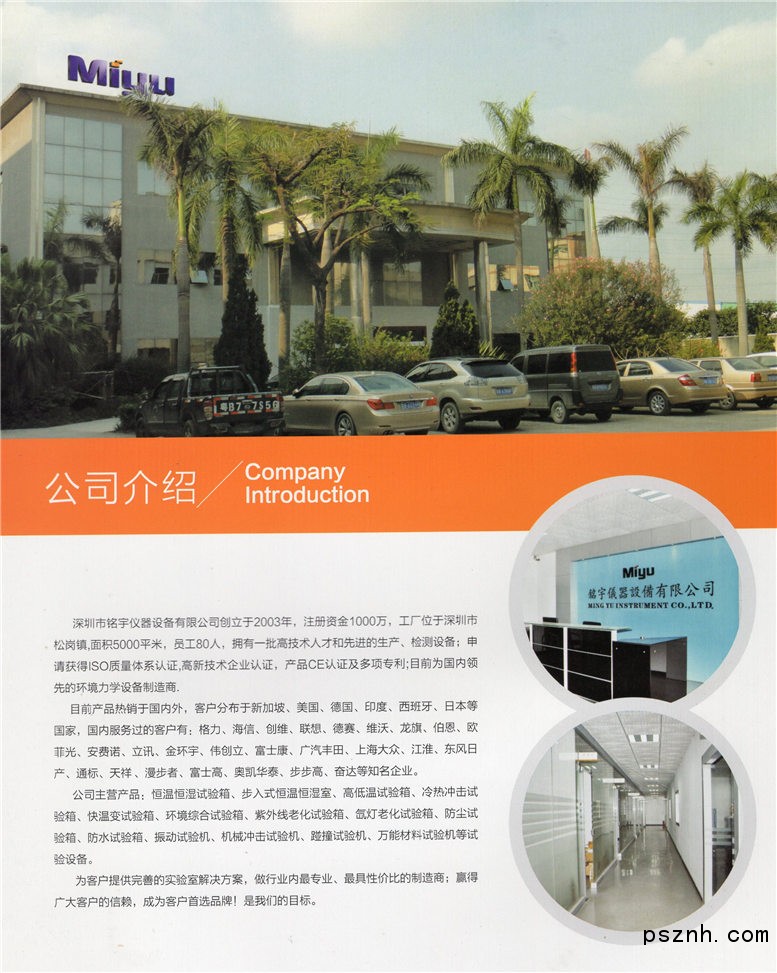 Shenzhen Mingyu instrument and equipment is established in 2003, which is registered capital 10 million RMB. Our factory is located in Songgang Town, Shenzhen and 3,500 M2.Our fifties staffs are engaged in the industry for many years with advanced manufacturing and testing equipment. The company has applied and obtained ISO,CE certification and multi patents as well as Hi-tech enterprise qualification. We are now a leading environmental mechanics manufacturer in China.