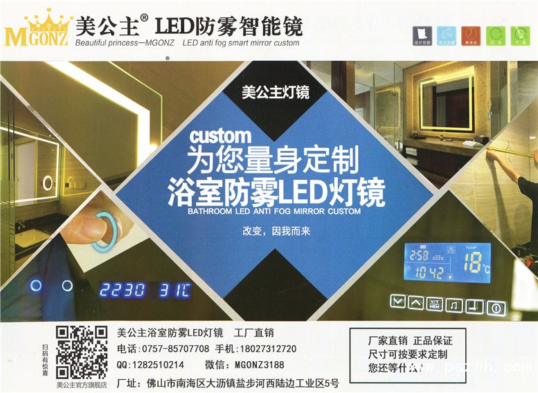 佛山市美視界智能科技有限公司是一家集生產(chǎn),銷售,安裝于一體的綜合性企業(yè),我們專業(yè)生產(chǎn):LED浴室鏡、智能電視鏡、防霧浴室鏡、藍牙音樂燈鏡,不銹鋼燈鏡,酒店定制衛(wèi)浴鏡,智能鏡柜等,可按客戶圖紙要求定制。我們的名字:美公主我們的產(chǎn)品主要出口世界各地,為很多豪華酒店、賓館,政府單位、商務(wù)辦公樓、百貨廣場、機場、家裝等服務(wù)過 我們不斷探索和創(chuàng)新,以“優(yōu)越的質(zhì)量,服務(wù)至上”的宗旨,以優(yōu)良的產(chǎn)品贏得廣大客戶的信任與支持。