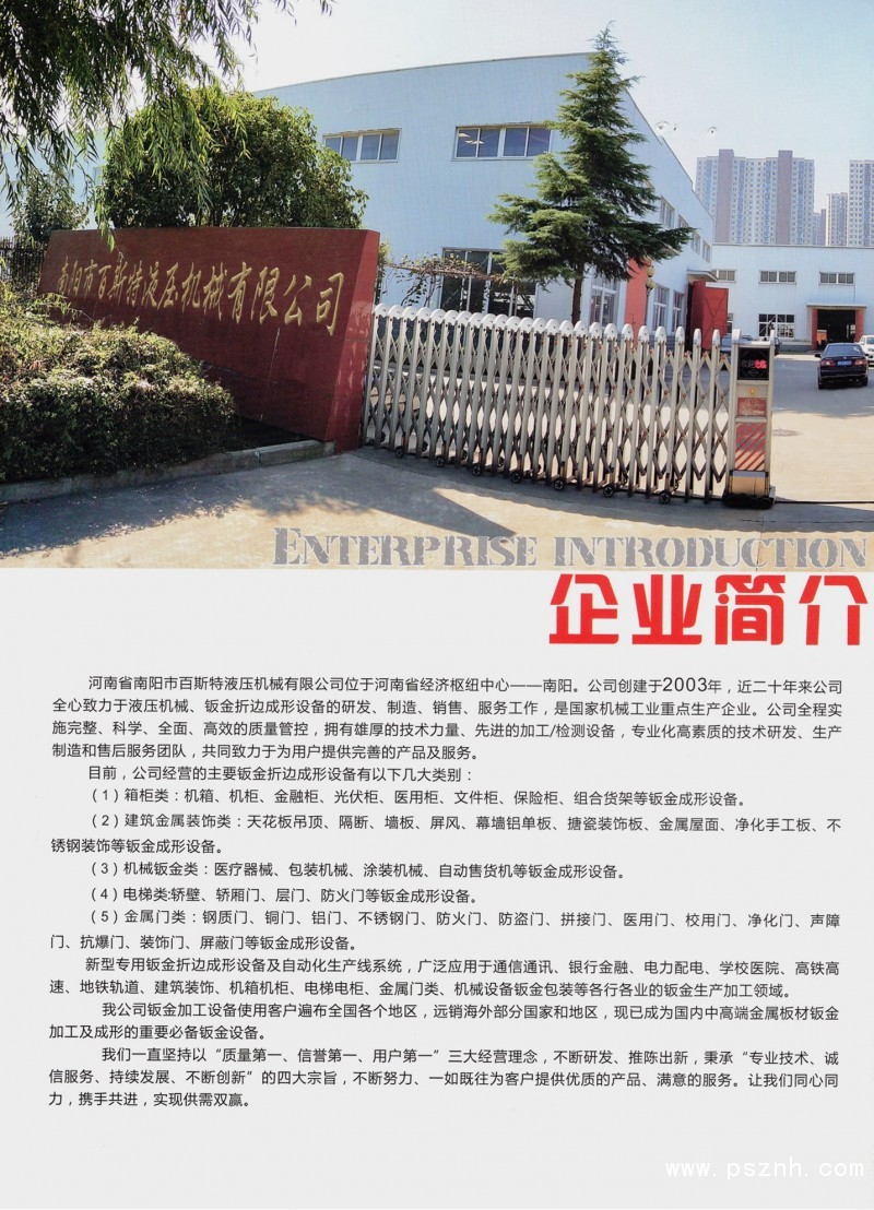 南陽市百斯特液壓機(jī)械有限公司位于河南省經(jīng)濟(jì)樞紐——南陽。公司創(chuàng)建于2003年,近二十年來公司全心致力于液壓機(jī)械、鈑金折邊成形設(shè)備的研發(fā)、制造、銷售、服務(wù)工作,是國家機(jī)械工業(yè)生產(chǎn)企業(yè)。公司全程實施完整、科學(xué)、全面、高效的質(zhì)理管控,擁有雄厚的技術(shù)力量、先進(jìn)的加工/檢測設(shè)備、高素質(zhì)的售后服務(wù)團(tuán)隊,致力于為用戶提供完善的產(chǎn)品及服務(wù),公司注冊商標(biāo)“天儀”。