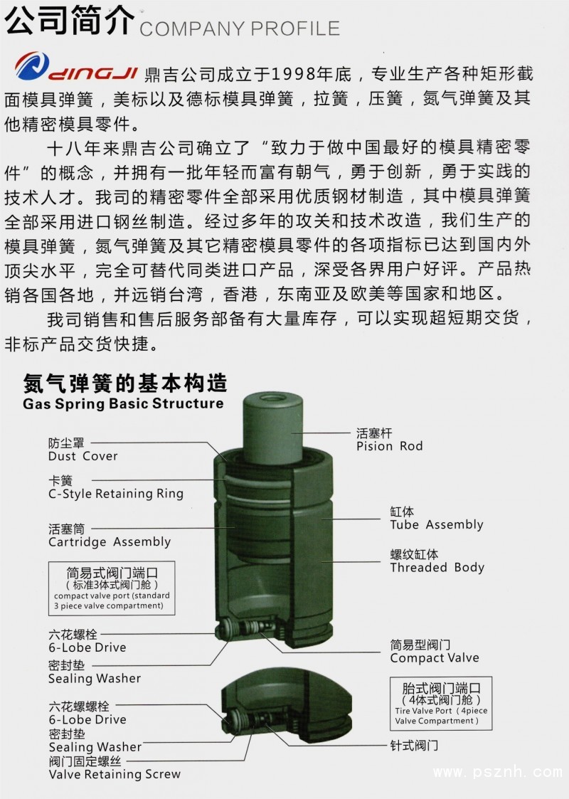 十八年來,鼎吉公司不斷發(fā)展,并擁有一批年輕而富有朝氣,敢于創(chuàng)新,勇于實踐的技術(shù)人才。我司的精密零件全部采用優(yōu)良鋼材制造,其中模具彈簧全部采用進(jìn)口鋼絲制造。經(jīng)過多年的攻關(guān)和技術(shù)改造,我們生產(chǎn)的模具彈簧、氮氣彈簧及其它精密模具零件的已達(dá)到國內(nèi)標(biāo)準(zhǔn)水平,完全可替代同類進(jìn)口產(chǎn)品,深受各界用戶好評。產(chǎn)品熱銷國內(nèi)各地,并遠(yuǎn)銷臺灣,香港,東南亞及歐美等國家和地區(qū)。