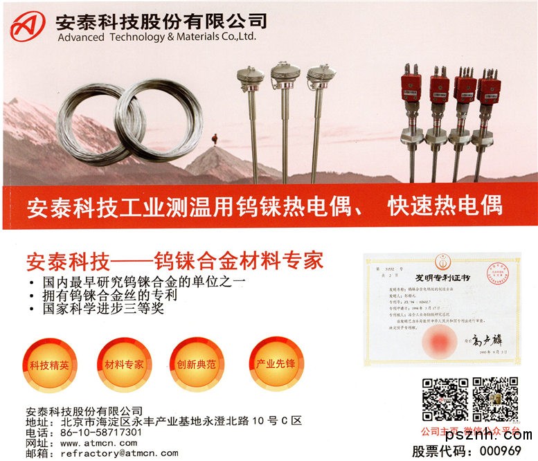 安泰科技股份有限公司 是以中國鋼研科技集團(tuán)有限公司(原國家級大型科研院所鋼鐵研究總院)為主要發(fā)起人,聯(lián)合清華紫光(集團(tuán))總公司等單位發(fā)起成立的高科技股份有限公司。是國家科技部及中科院聯(lián)合認(rèn)定的國家高技術(shù)企業(yè),也是被北京市科學(xué)技術(shù)委員會認(rèn)定的骨干高新技術(shù)企業(yè)。