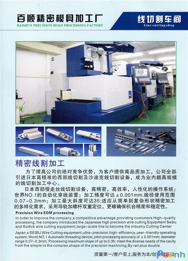 車(chē)間設(shè)備:Sodick日本沙迪克慢走絲(AG、AQ、AD系列)4臺(tái),日本西部高精密慢走絲(可加工0.05mm線精度0.002mm),臺(tái)灣福裕精密大水磨一臺(tái)(平面度厚度精度0.002mm),建得大水磨二臺(tái),精密小磨床多臺(tái)( 精度0.002mm),銑床等。