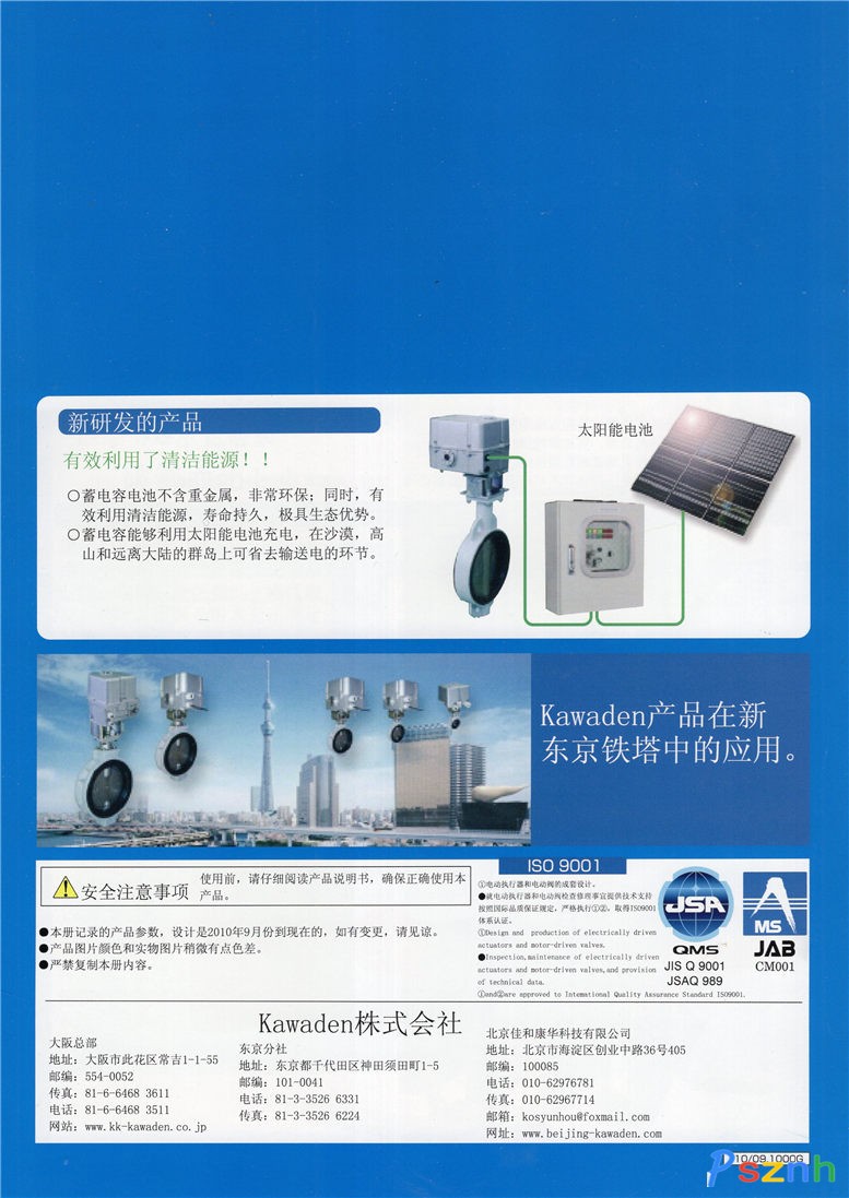 北京佳和康華科技有限公司位于北京市昌平區(qū)新元科技園,是日本KAWADEN株式會社在華子公司,總部位于日本大阪,專業(yè)從事KAWADEN系列電動執(zhí)行器,工業(yè)控制閥,全自動緊急切斷閥等產(chǎn)品設(shè)計(jì),研發(fā),生產(chǎn),銷售。公司憑借多年的研發(fā)生產(chǎn)經(jīng)驗(yàn)以及最全面,最高品質(zhì)的流體自控產(chǎn)品和專業(yè)的技術(shù)成套服務(wù),長期以來與世界500強(qiáng)乃至100強(qiáng)企業(yè)(日立,三菱重工等)形成了非常良好的供應(yīng)關(guān)系。我公司已取得多項(xiàng)產(chǎn)品新型專利技術(shù)和發(fā)明專利,目前產(chǎn)品已通過防爆認(rèn)證,CE認(rèn)證等,本公司擁有自主進(jìn)出口權(quán)。