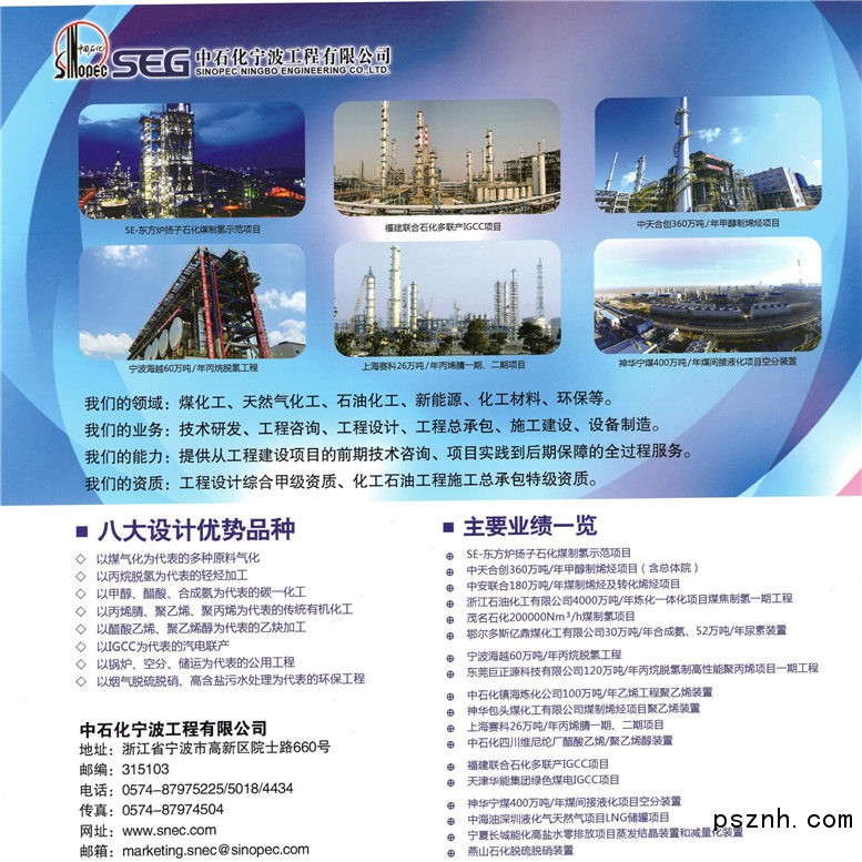 中石化寧波工程有限公司是以技術(shù)為先導(dǎo),設(shè)計(jì)為基礎(chǔ),工程總承包和工程項(xiàng)目管理為主體,集科研開發(fā)、工程咨詢、工程設(shè)計(jì)、設(shè)備制造、裝置施工和檢維修服務(wù)于一體,擁有專利、專有技術(shù),面向國內(nèi)、國際兩個(gè)市場提供技術(shù)服務(wù)和管理服務(wù)的全能型工程公司。