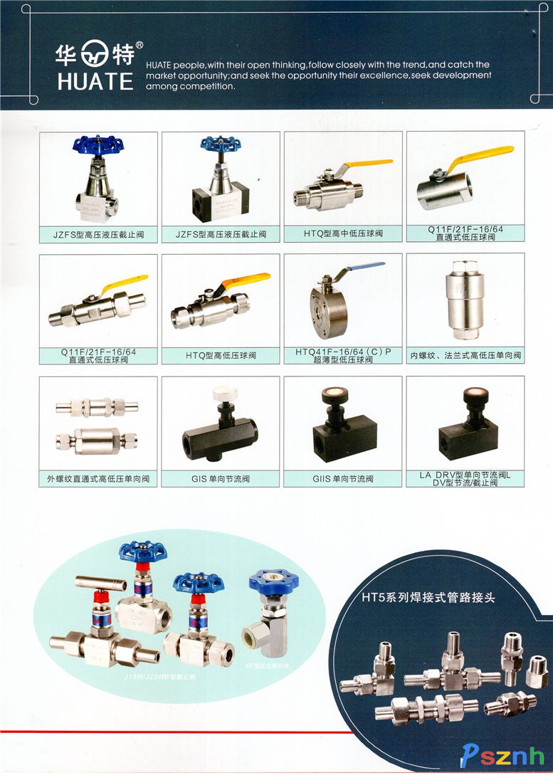 主要產(chǎn)品有:各種材質DM325MM、PN2、5-42MPa外螺紋針型閥,DN3-50MM,PN2.5-MPa,內(nèi)螺紋針型閥DN3-6,PN2.5-32MPa,壓力表截止閥及卡套球閥、三通閥、焊接式卡套儀表管件等250個品種,720個規(guī)格的產(chǎn)品。