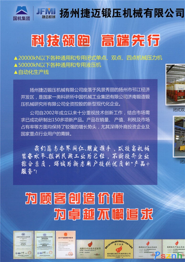 揚(yáng)州捷邁鍛壓機(jī)械有限公司是''揚(yáng)州鍛壓機(jī)床有限公司''與''濟(jì)南鑄造鍛壓機(jī)械研究所''共同投資組建的新型現(xiàn)代化企業(yè)。主要生產(chǎn)各種類型和規(guī)格的液壓機(jī)、閉式機(jī)械壓力機(jī)及其自動(dòng)化成套設(shè)備。| 公司全體員工按照''揚(yáng)州捷邁--永無(wú)止境地超越!''的總體追求,堅(jiān)持貫徹以''開(kāi)發(fā)新品求生存,拓寬市場(chǎng)求業(yè)績(jī),夯實(shí)基礎(chǔ)求發(fā)展,管理創(chuàng)新求增效''的經(jīng)營(yíng)管理理念,精心打造“揚(yáng)州捷邁”品牌。公司成立以來(lái),在董事會(huì)的正確領(lǐng)導(dǎo)和各級(jí)政府部門的關(guān)懷支持下,通過(guò)全體員工的共同努力,已先后榮獲:''江蘇省高新技術(shù)企業(yè)”;“江蘇省民營(yíng)科技企業(yè)”;“江蘇省火炬項(xiàng)目承擔(dān)單位”;“質(zhì)量、信譽(yù)先進(jìn)單位”;“工商銀行資信AA等級(jí)”;“國(guó)家火炬計(jì)劃邗江金屬板材加工設(shè)備產(chǎn)業(yè)基地骨干企業(yè)”等榮譽(yù)稱號(hào);揚(yáng)州市大型鍛壓設(shè)備及成套化、集成化工程技術(shù)研發(fā)中心和揚(yáng)州市級(jí)企業(yè)技術(shù)中心就設(shè)在本公司。| 公司充分利用投資雙方多年來(lái)在鍛壓產(chǎn)品領(lǐng)域所積累的產(chǎn)品設(shè)計(jì)開(kāi)發(fā)經(jīng)驗(yàn)和在機(jī)械加工制造方面的特有優(yōu)勢(shì),以及已形成的遍布全國(guó)的銷售服務(wù)網(wǎng)絡(luò),向市場(chǎng)提供先進(jìn)、高效、實(shí)用、可靠的優(yōu)質(zhì)鍛壓產(chǎn)品。以其產(chǎn)品在性能、質(zhì)量、價(jià)格、服務(wù)、周期、信譽(yù)等方面的綜合優(yōu)勢(shì),限度地去滿足不同用戶的不同層次的需求。|| 揚(yáng)州捷邁人堅(jiān)信: 沒(méi)有不講理的用戶| 只有不滿意的產(chǎn)品| 用戶滿意是我們永遠(yuǎn)的追求!