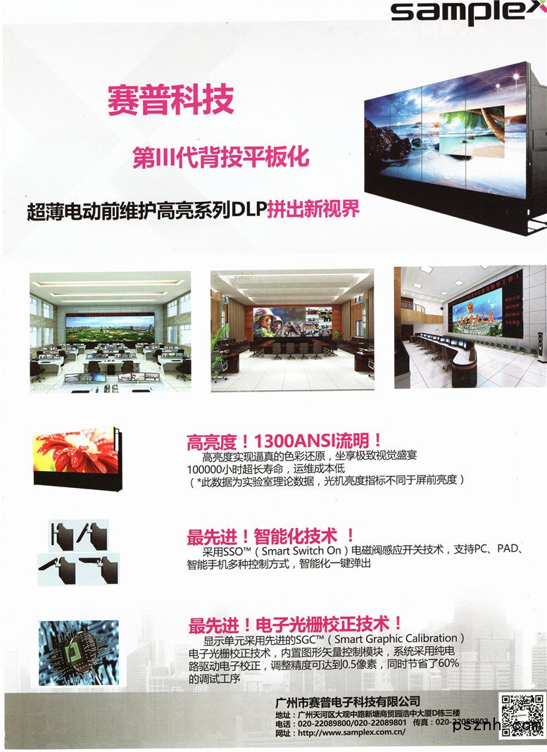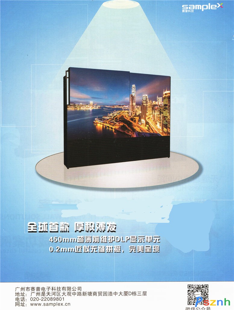廣州市賽普電子科技有限公司專注于從事超高分辨率大屏幕顯示系列產(chǎn)品的研發(fā)和生產(chǎn),產(chǎn)品主要包括超薄前維護DLP拼接顯示單元、OLED拼接透明屏及OLED鏡面屏、DID液晶拼接顯示單元、等離子拼接顯示單元、圖像拼接處理器、大尺寸LCD顯示單屏及觸摸屏、矩陣等各種外圍設備,以及控制軟件、觸控應用軟件等。在光學、電子、機械、圖像處理、信息傳輸、觸摸屏控制及應用軟件等多個專業(yè)領域均擁有與大屏幕顯示相關的核心技術。
