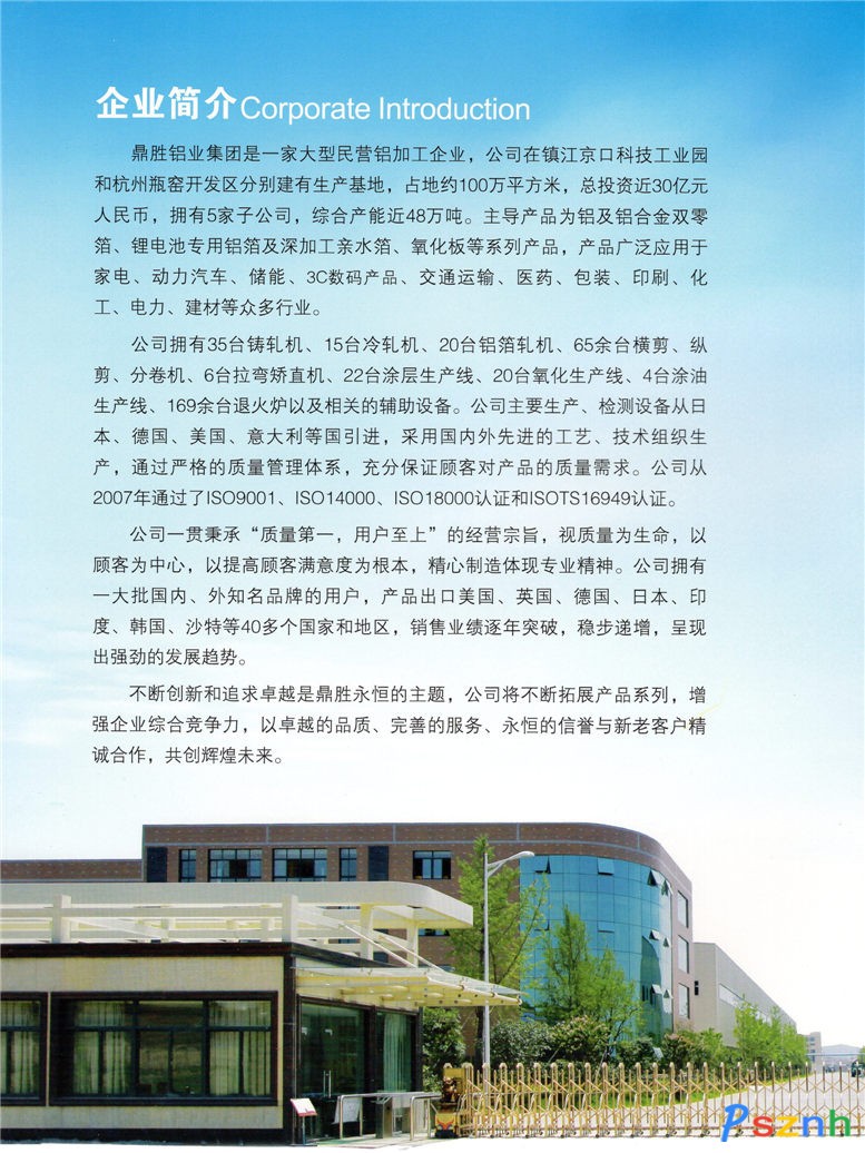 鼎勝鋁業(yè)集團是一家專業(yè)從事生產(chǎn)各類鋁板、鋁帶、鋁箔的高科技企業(yè),在江蘇鎮(zhèn)江和浙江杭州分別建有生產(chǎn)基地,是目前全球最大的空調(diào)箔生產(chǎn)商,是中國最大的雙零箔生產(chǎn)商。