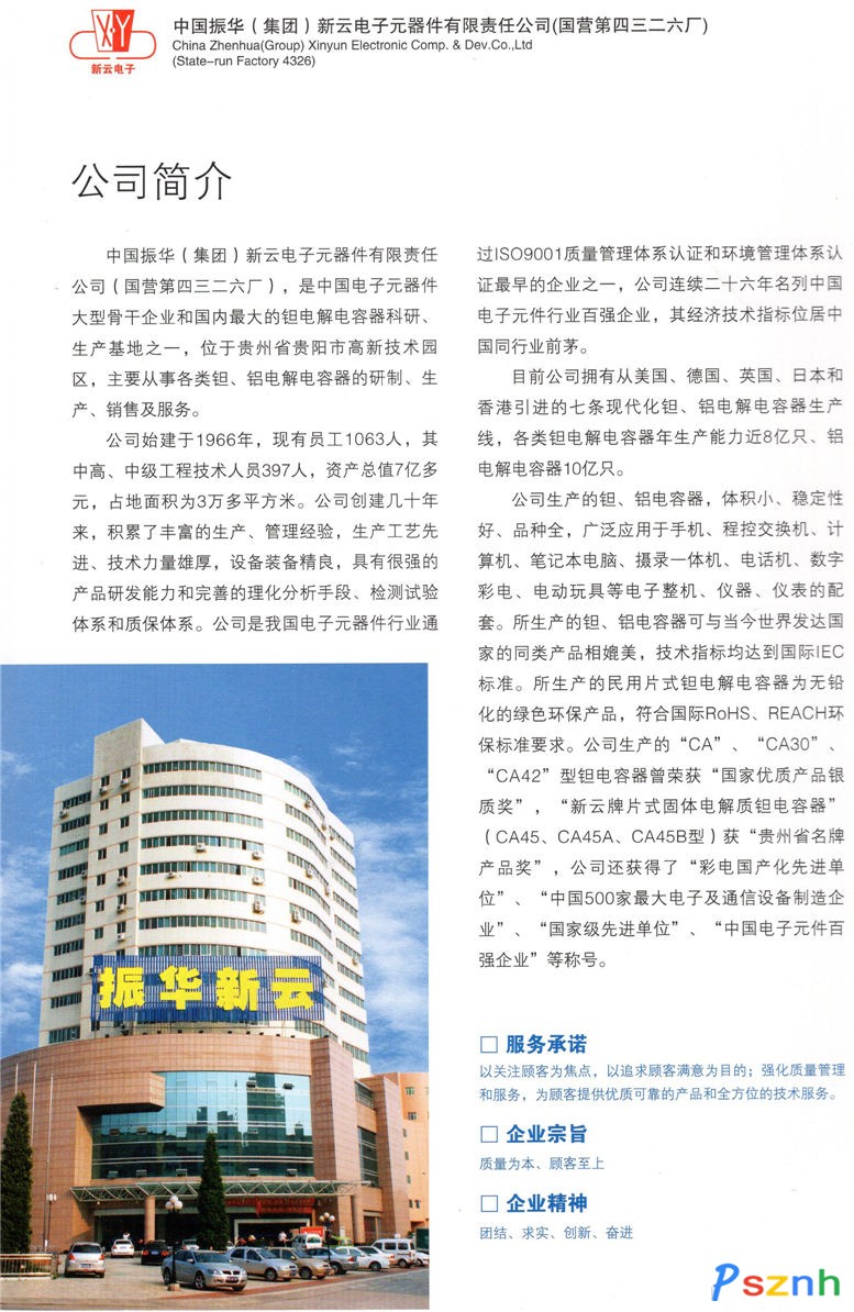 中國振華(集團)新云電子元器件有限責任公司(國營第四三二六廠),隸屬于中國振華電子集團有限公司,是上市公司“中國振華(集團)科技股份有限公司”旗下之主要成員企業(yè)和我國電子元器件大型重點骨干企業(yè),也是我國電子元器件重點配套企業(yè),截止2017年,已連續(xù)30年榮登中國電子元件百強企業(yè)排行榜,并且獲得歐洲航天局A級供應商資格。