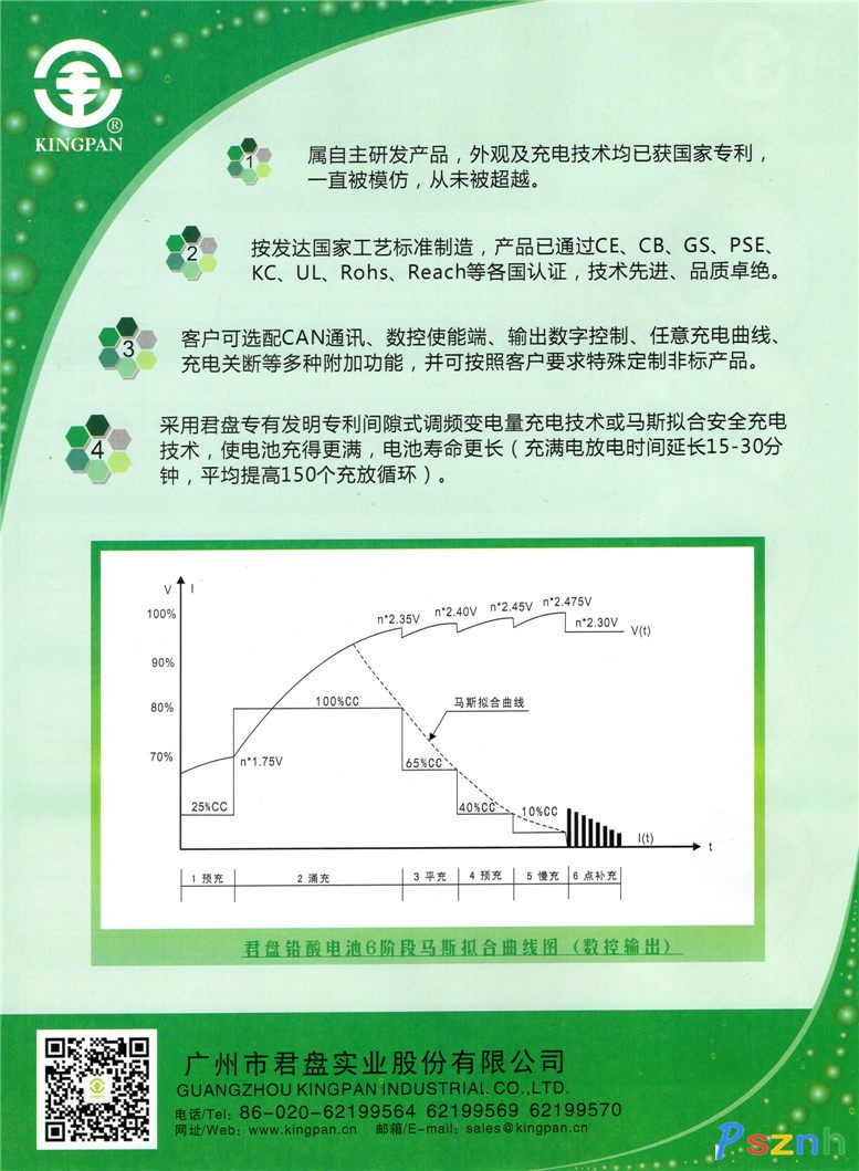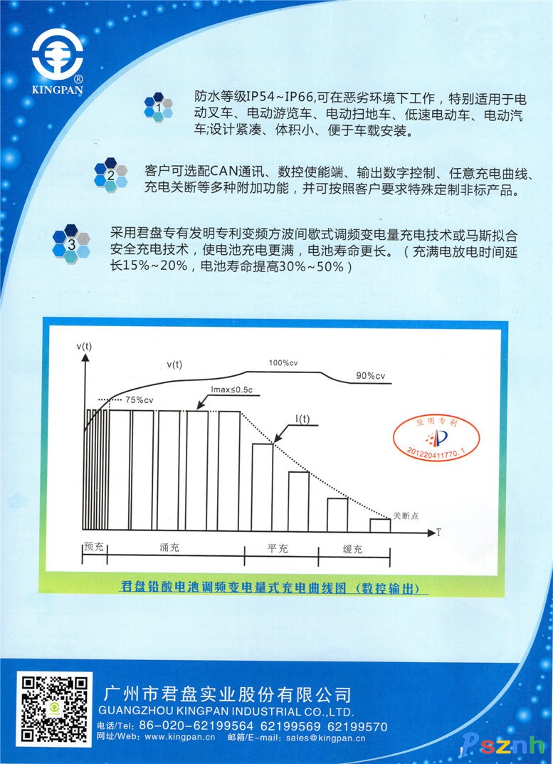 廣州市君盤實業(yè)股份有限公司擁有獨立自主研發(fā)能力,在鉛酸電池、鋰電池、鎳氫電池三大類充電理論上有重大突破與創(chuàng)新,獲得各類實用新型、發(fā)明專利數(shù)十項,其中“間歇式調(diào)頻變電量充電技術(shù)”具有國際先進水平,使充電時間縮短三分之一,充滿放電能力延長20%,電池使用壽命延長30%(現(xiàn)已申請30多國發(fā)明專利)。