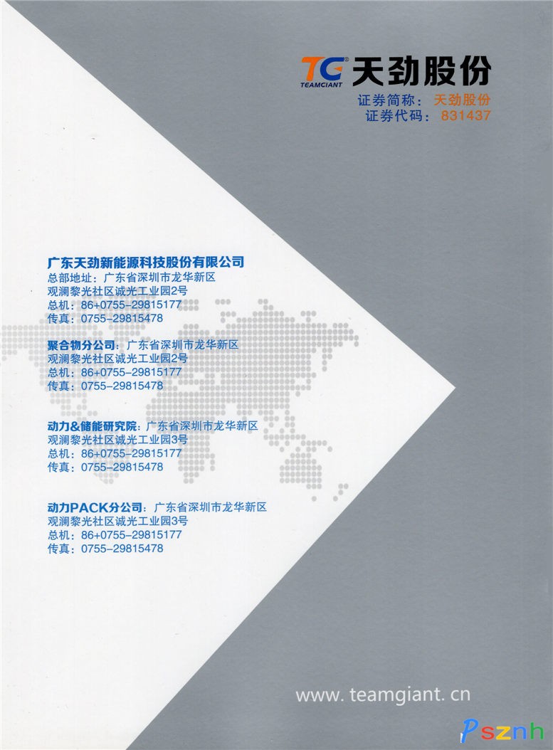 廣東天勁新能源科技股份有限公司(簡(jiǎn)稱天勁股份),創(chuàng)立于2006年9月,是一家專業(yè)提供清潔新能源汽車動(dòng)力電池系統(tǒng)整體解決方案的國(guó)家高新技術(shù)企業(yè);旗下?lián)碛猩钲谑刑靹判履茉纯萍加邢薰荆粡V東天勁新能源科技股份有限公司(數(shù)碼)PACK分公司;廣東天勁新能源科技股份有限公司聚合物分公司;動(dòng)力&儲(chǔ)能研究院;動(dòng)力電池PACK分公司等5家分(子)公司。天勁股份于2014年12月8日正式在北京掛牌“新三板”,成功登陸資本圈;證券簡(jiǎn)稱:天勁股份;證券代碼:831437。于2015年7月16日正式做市交易。2015年底,被同行業(yè)以及華南地區(qū)第三方權(quán)威機(jī)構(gòu)-高工產(chǎn)研推薦為“華南聚合物鋰離子動(dòng)力電池領(lǐng)導(dǎo)品牌;2016年7月8日,錄入國(guó)家工信部“符合《汽車動(dòng)力蓄電池行業(yè)規(guī)范條件》企業(yè)目錄(第四批)”名錄;8月10日,被列為“廣東省動(dòng)力電池標(biāo)準(zhǔn)化技術(shù)委員會(huì)委員單位”。
