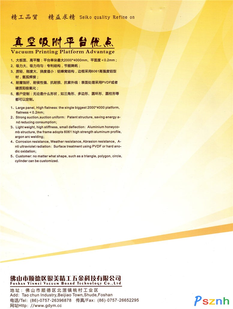 佛山市順德區(qū)銀美精工五金科技有限公司是一家專業(yè)從事真空盒、真空板、真空夾具、氣浮平臺、真空吸氣平臺研發(fā)、制造、銷售和服務(wù)為一體的專業(yè)制造商。主要為數(shù)碼噴印行業(yè)和數(shù)碼切割行業(yè)以及網(wǎng)印等行業(yè)提供真空吸附工作平臺和吸附解決方案。公司現(xiàn)有廠房5000余平方米,員工60余名。銀美公司致力于成為最受客戶信賴的吸附平臺品牌。