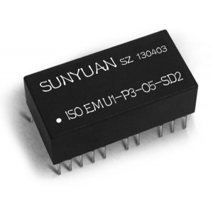 SunYuan  DIP24 Pin封裝ISO EM-SD系列,模擬有源信號隔離變送器配電器是一種磁電隔離的混合集成電路。該IC支持單端信號及差分信號輸入,且內部在同一芯片上集成了一個多組隔離的DC/DC變換電源和一組磁電耦合的模擬信號隔離放大器隔離變送器。特別適用于:0-10mV/0-20mV/0-75mV/0-100mV的小信號放大及0-5V/0-10V/0-1mA/4-20mA等標準信號的隔離變送。它采用磁電偶合的低成本方案,主要用于對EMC(電磁干擾)無特殊要求的場合。該芯片的輸出的隔離電源除了為內部放大電路供電外,還可以向外提供一組高負載能力的 (最大40mA) 隔離穩(wěn)壓電源和兩個基準電壓源,可供外部電路擴展用,如電橋電路、基準電路等。SMD工藝結構及新技術隔離措施使該器件能達到:輔助電源、信號輸入/輸出、配電電源之間3000VDC四隔離。并且能滿足工業(yè)級寬溫度、潮濕、震動的現(xiàn)場惡劣工作環(huán)境要求。