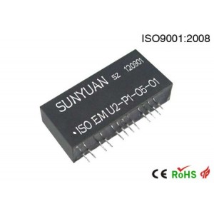 SunYuan ISO EM U-P-O-O電壓輸入系列和ISO EM A-P-O-O電流輸入系列1進(jìn)2出低成本小體積IC封裝的模擬量隔離變送器隔離放大器 ,是一種將(傳感器輸出)單路模擬電壓或電流信號經(jīng)隔離、分配、轉(zhuǎn)換成兩路精度、線性度相匹配的標(biāo)準(zhǔn)模擬信號的混合集成電路。該IC在同一芯片上集成了高隔離的DC/DC分布電源和多組磁電耦合的模擬信號隔離放大器,采用磁電偶合的低成本方案,主要用于對EMC(電磁干擾)無特殊要求的場合。輸入及輸出側(cè)寬爬電距離及內(nèi)部隔離措施使該芯片可達(dá)到電源、信號輸入、兩路信號輸出的3KVDC,四隔離。ISO EM系列單信號輸入雙輸出隔離變送器IC產(chǎn)品使用非常方便,免零點調(diào)節(jié),只需外接增益調(diào)節(jié)電位器,即可實現(xiàn)工業(yè)現(xiàn)場各種傳感器信號的隔離、分配、轉(zhuǎn)換功能,并能滿足工業(yè)級寬溫度、潮濕、震動等惡劣工作環(huán)境要求。