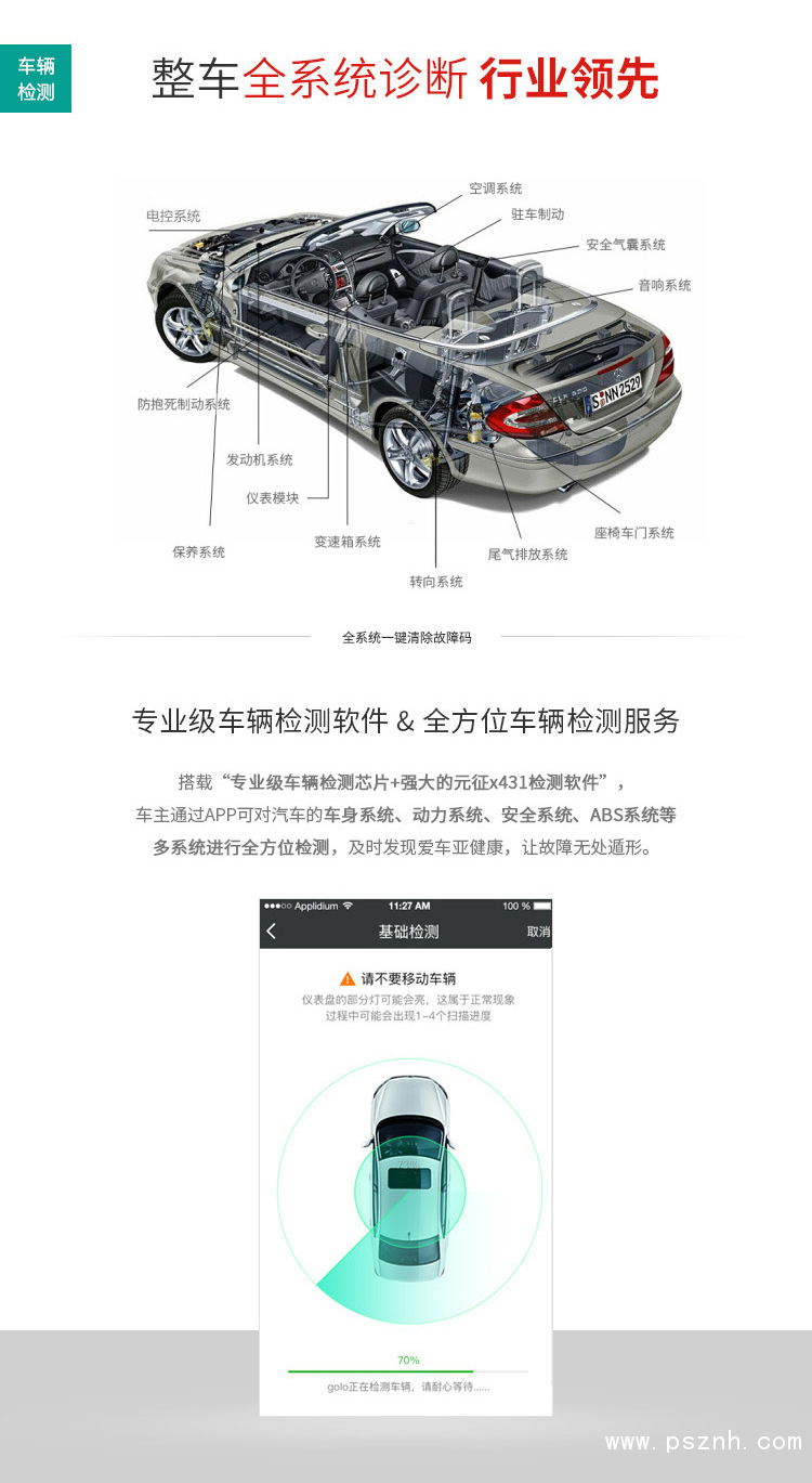 搭載“專業(yè)級車輛檢測芯片+強大的元征x431檢測軟件”,車主通過APP可對汽車的車身系統(tǒng)、動力系統(tǒng)、安全系統(tǒng)、ABS系統(tǒng)等多系統(tǒng)進行全方位檢測,并獲得一份專業(yè)檢測報告。