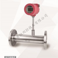 熱式氣體質(zhì)量流量計(jì)是基于熱擴(kuò)散原理而設(shè)計(jì)的,該儀表采用恒溫差法對氣體進(jìn)行準(zhǔn)確測量,傳感器部分由兩個(gè)基準(zhǔn)級鉑電阻溫度傳感器組成,儀表工作時(shí),一個(gè)傳感器不間斷地測量介質(zhì)溫度 T1;另一個(gè)傳感器自加熱到高于介質(zhì)溫度 T2,它用于感測流體流速,稱為速度傳感器。該溫度ΔT=T2-T1,T2>T1,當(dāng)有流體流過時(shí),由于氣體分子碰撞傳感器并將 T2的熱量帶走,使 T2 的溫度下降,若要使ΔT 保持不變,就要提高 T2 的供電電流,氣體流動速度越快,帶走的熱量也就越多,氣體流速和增加的熱量存在固定的函數(shù)關(guān)系。熱式氣體質(zhì)量流量計(jì)具有體積小、數(shù)字化程度高、安裝方便,測量準(zhǔn)確等優(yōu)點(diǎn)。