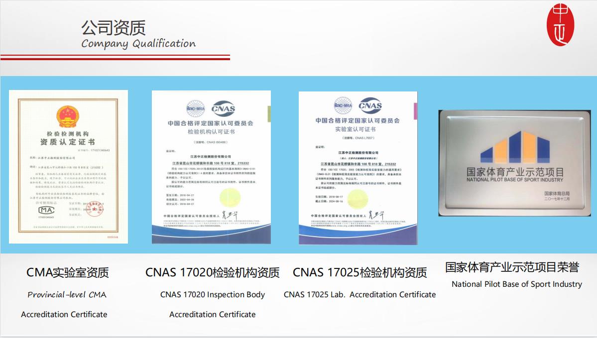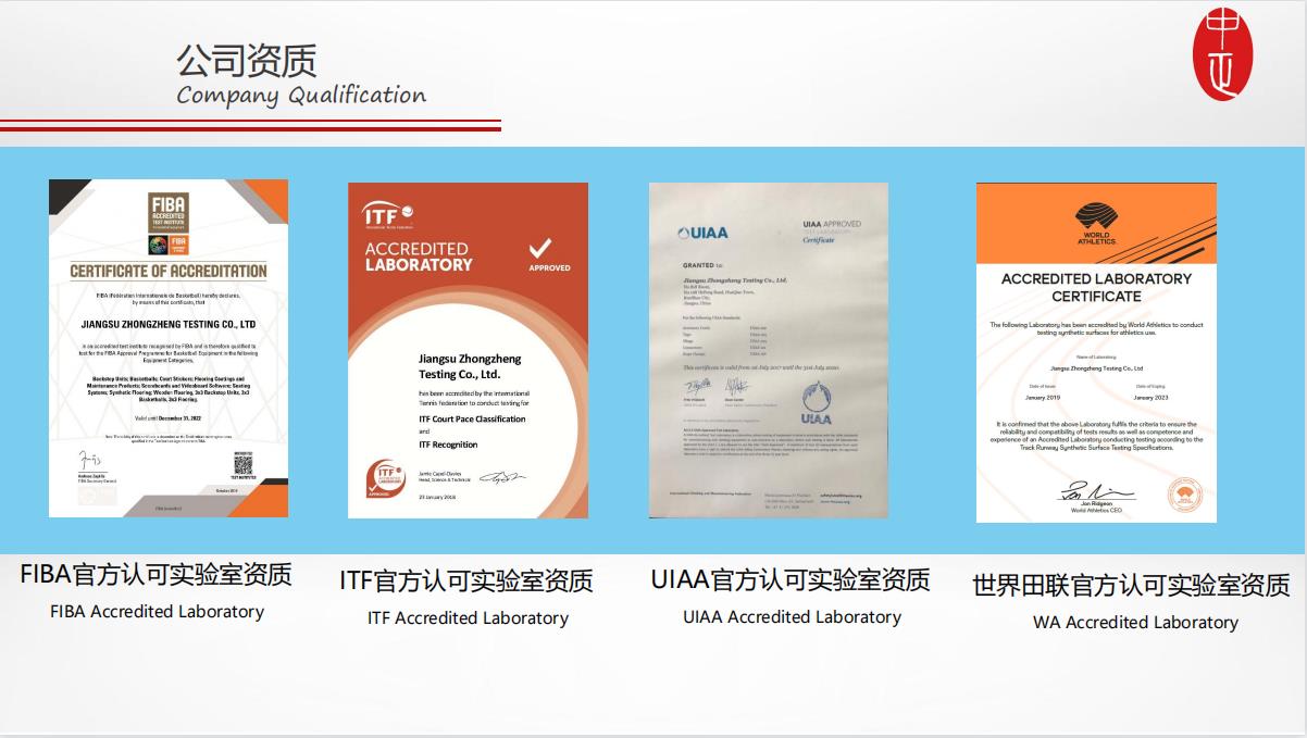 江蘇中正檢測股份有限公司作為國際田聯(lián)IAAF、國際籃聯(lián)FIBA、國際網(wǎng)聯(lián)ITF、國際登聯(lián)UIAA、國際羽聯(lián)BWF、國際足聯(lián)FIFA、國際手聯(lián)IHF等體育場館項(xiàng)目亞太區(qū)技術(shù)服務(wù)合作伙伴,江蘇中正檢測股份有限公司在中國區(qū)建立官方認(rèn)可實(shí)驗(yàn)室,為亞太地區(qū)提供公正、科學(xué)、安全、健康、環(huán)保的檢測認(rèn)證服務(wù)。