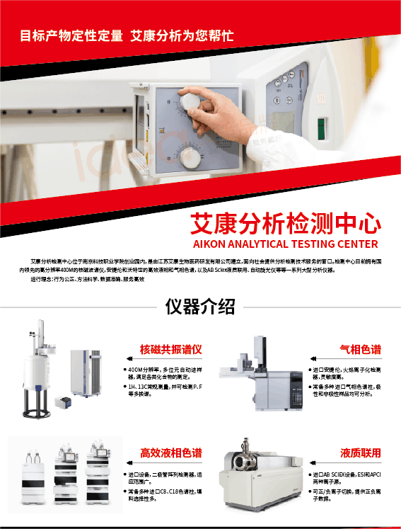 南京艾康分析檢測(cè)中心位于南京市江北新區(qū)化工園內(nèi),是由江蘇艾康生物醫(yī)藥研發(fā)有限公司建立,面向社會(huì)提供分析檢測(cè)技術(shù)服務(wù)的窗口。成立以來(lái)檢測(cè)中心不斷的發(fā)展和完善,以符合行業(yè)標(biāo)準(zhǔn)的分析檢測(cè)實(shí)驗(yàn)室,和“行為公正、方法科學(xué)、數(shù)據(jù)準(zhǔn)確、服務(wù)高效”的運(yùn)行理念,為社會(huì)各界提供專業(yè)高效的技術(shù)服務(wù)。